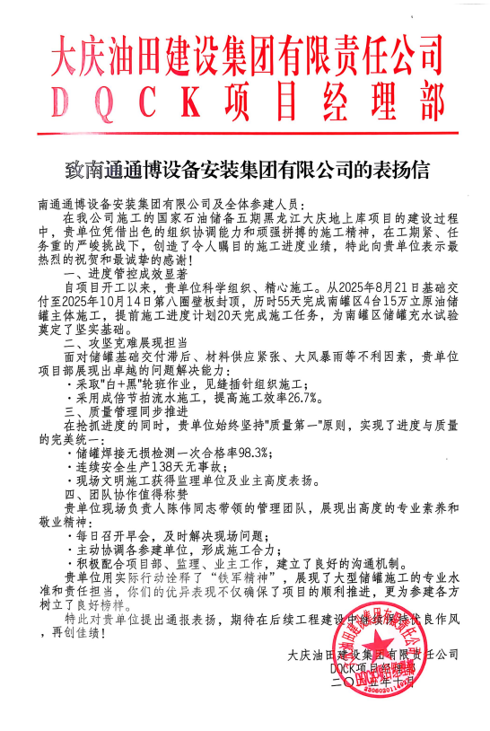 金秋十月的大慶,清風(fēng)送爽,碩果盈枝。這片承載著光榮與夢(mèng)想的熱土,在收獲的季節(jié)里煥發(fā)出更加蓬勃的生機(jī)。14日下午2點(diǎn),第三分公司大慶DQCK項(xiàng)目部工地上,機(jī)器轟鳴、繁忙如常,在集團(tuán)董事、常務(wù)副總趙偉斌的帶領(lǐng)下,正緊張進(jìn)行第四臺(tái)15萬立方米儲(chǔ)罐的封頂作業(yè)。自今年5月進(jìn)駐以來,項(xiàng)目部全體人員對(duì)標(biāo)鐵人王進(jìn)喜,將“鐵人精神”深深鐫刻在每一次精準(zhǔn)操作、每一項(xiàng)技術(shù)突破之中。工地內(nèi)外,“通博風(fēng)華”處處綻放——從高效推進(jìn)項(xiàng)目進(jìn)程,到精細(xì)管控降本增效;從安全生產(chǎn)的嚴(yán)謹(jǐn)細(xì)節(jié),到綠色低碳的堅(jiān)定踐行。8月21日儲(chǔ)罐基礎(chǔ)交付至10月14日第八圈壁板封頂,僅歷時(shí)55天提前20天完成了南罐區(qū)4臺(tái)15萬立方米原油儲(chǔ)罐封頂,為南罐區(qū)儲(chǔ)罐充水試驗(yàn)奠定了堅(jiān)實(shí)基礎(chǔ)。大慶油田建設(shè)集團(tuán)向我司函寄了表?yè)P(yáng)信,表?yè)P(yáng)全體參建人員克服了工期緊、任務(wù)重的嚴(yán)峻挑戰(zhàn),創(chuàng)造了令人矚目的施工進(jìn)度業(yè)績(jī);并向項(xiàng)目負(fù)責(zé)人陳偉頒發(fā)了“優(yōu)秀管理者”榮譽(yù)證書,盛贊了我司大型儲(chǔ)罐施工的專業(yè)水準(zhǔn)和責(zé)任擔(dān)當(dāng)!通博人以實(shí)干擔(dān)當(dāng)詮釋新時(shí)代“鐵人精神”的深刻內(nèi)涵,以銳意進(jìn)取、追求卓越展現(xiàn)“通博風(fēng)華”。